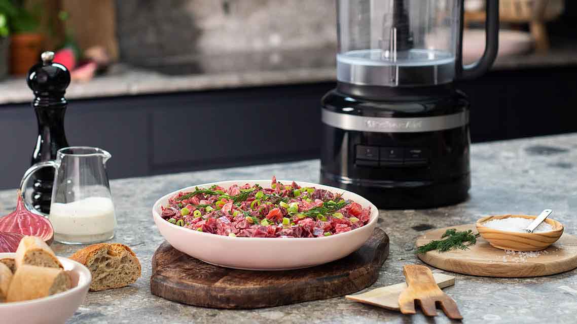 Kender du til den der ene ret på menuen, der får dig til at føle dig fancy bare ved at bestille den? Det er denne ret, bare i hjemmelavet version, og det kræver ingen avancerede knivkundskaber. Hakkeren fjerner enhver tvivl, når oksekødet skal forberedes, og den rammer den helt rigtige fine tatartekstur hver gang. Top den med en sky af cremet mozzarellamousse, eller vælg guacamole som alternativ for at få et mælkefrit twist.