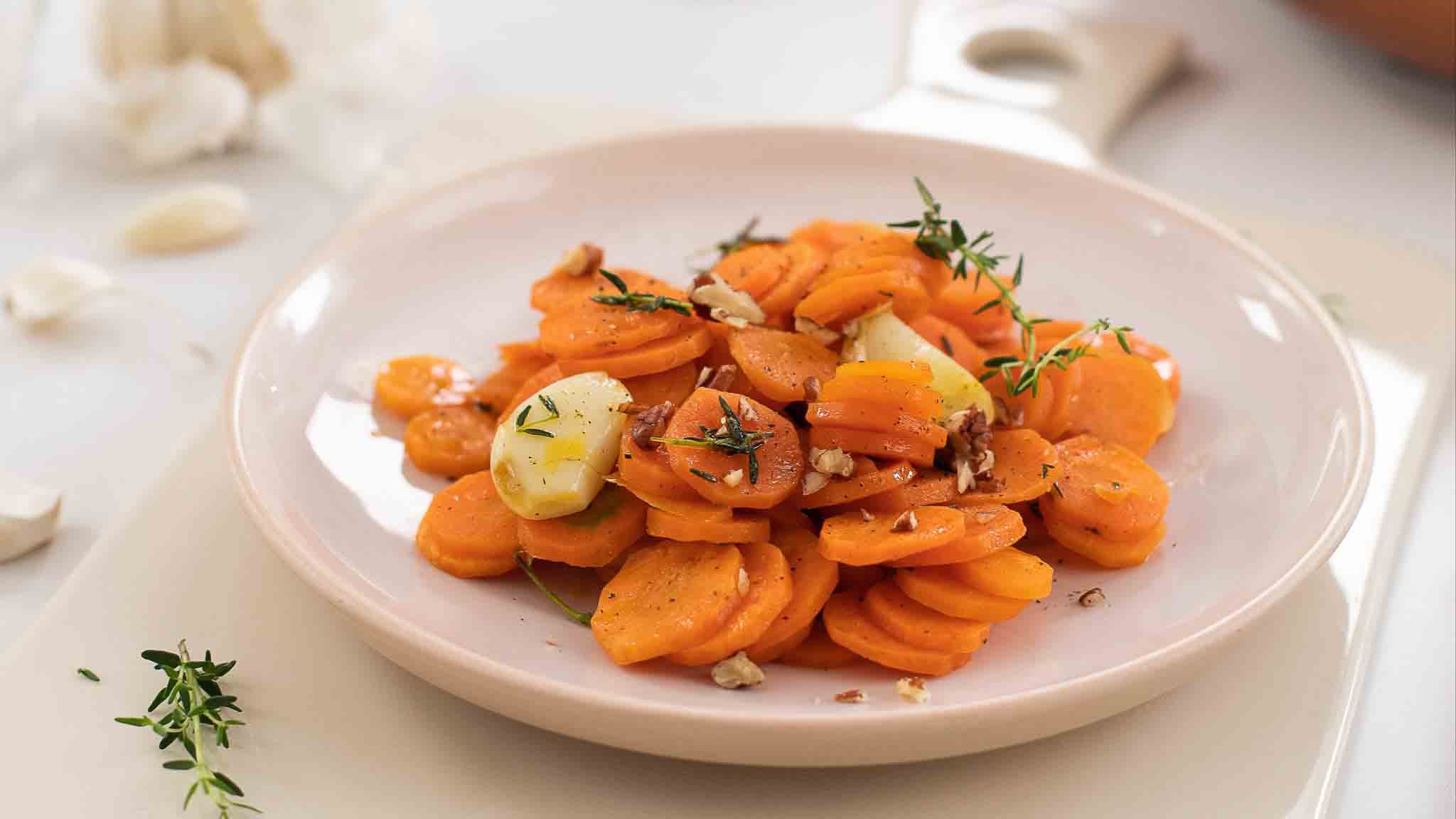 Nogle former for tilbehør er der bare for at hjælpe til. Denne? Den er der for at skinne. Skinnende gulerødder i tynde skiver, karamelliserede kanter og en glasur af ahorn, hvidløg og timian, der rammer den perfekte søde og krydrede smagsnuance. Det er den slags tilbehør, der gør måltidet lidt særligt, især på en hverdagsaften.