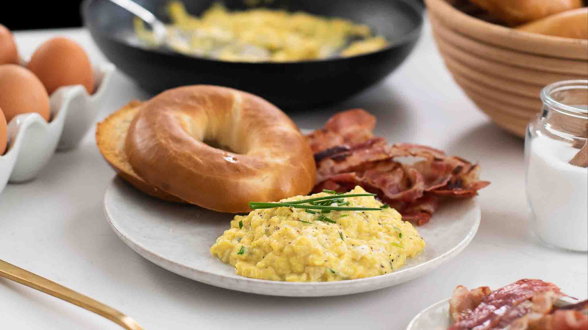 Glem alt, hvad du ved om røræg. Fra nu af pisker du som det første æggene, til de skummer, for det er hemmeligheden bag at få dem helt silkebløde og luftige på café-måden. Ingen grund til at bruge muskelkraft – bare lad din køkkenmaskine gøre arbejdet. Når røræggene er tilberedt, kan du putte dem på ristet brød, bagels eller kartoffelpandekager og toppe med det, du har ved hånden: purløg, ost eller en håndfuld spinat.