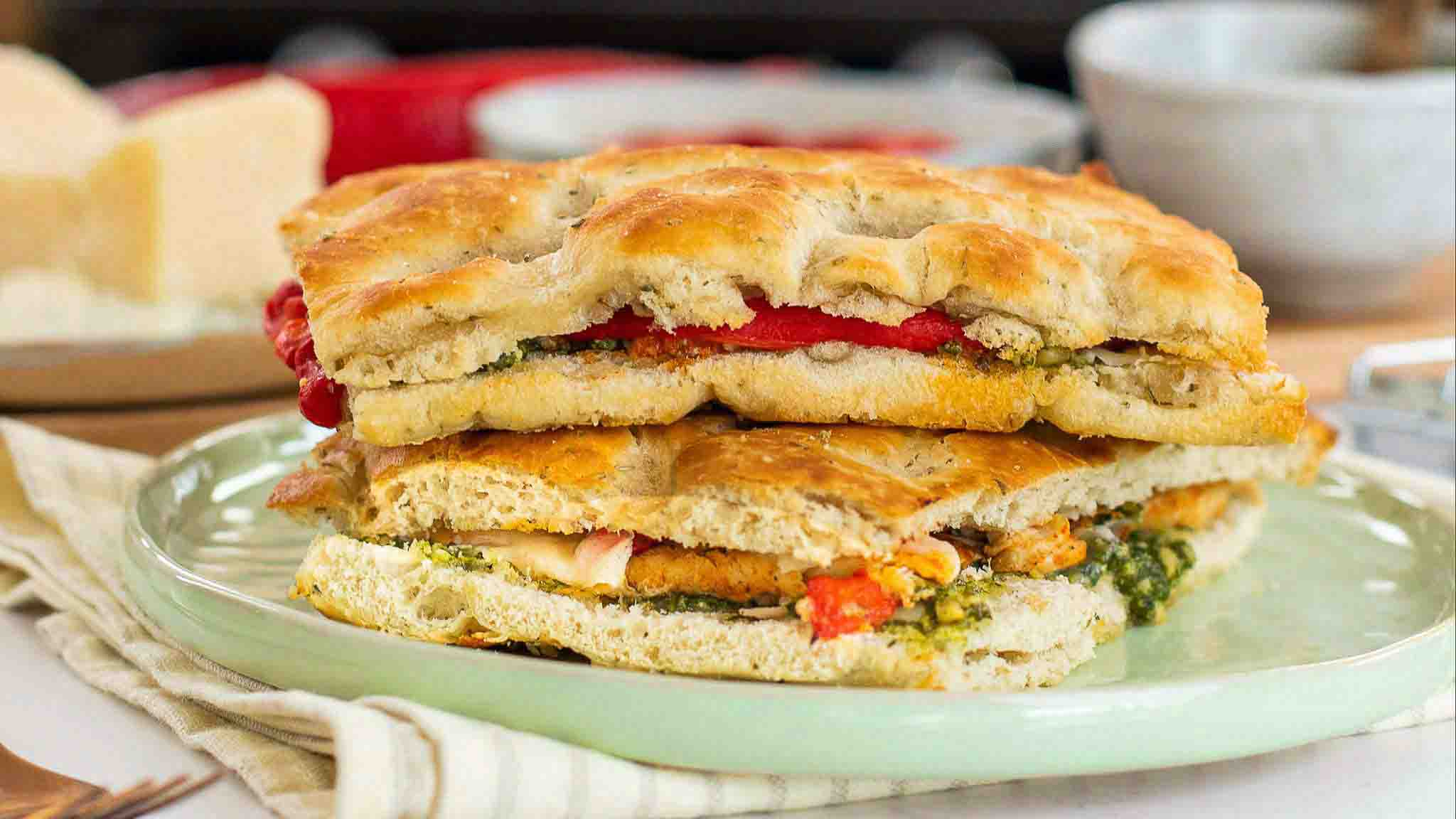 Focaccia er det oplagte valg til denne opskrift, men enhver solid brødrest vil uden tvivl få det til at spille, så snart den er fyldt med pesto, kylling og søde, stegte peberfrugter og ristet til en svampet herlighed i sandwichholderen.