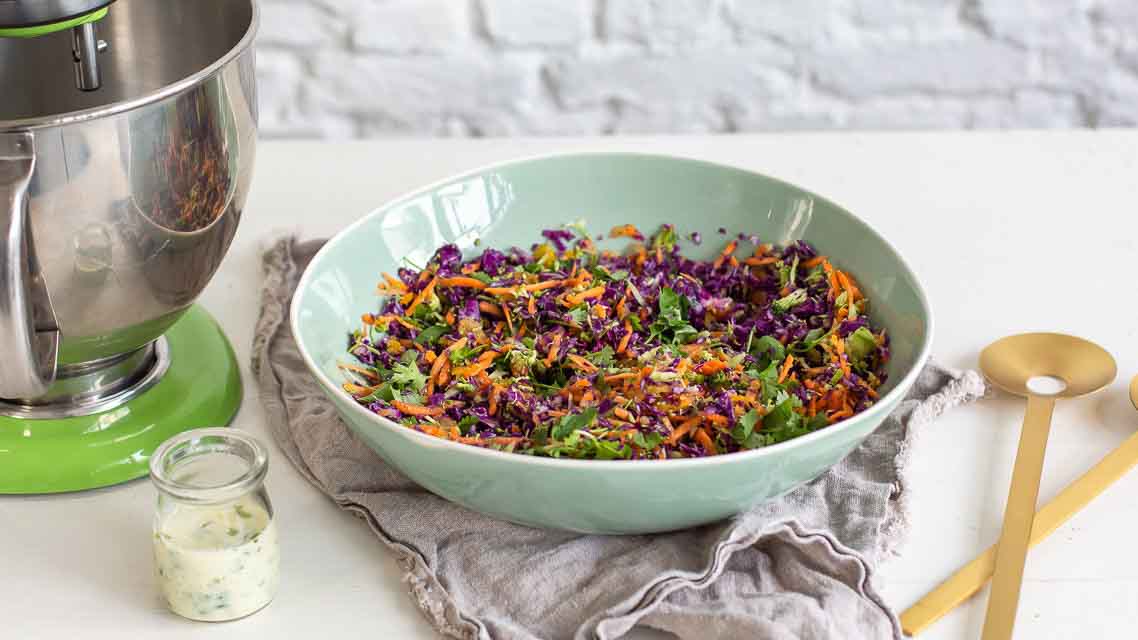 Sprød, skarp og tilpas cremet – denne coleslaw ved, hvad den skal. Yoghurtstrejfet gør, at den klassiske mayo-dressing er både silkeblød og let, mens sprødheden fra det finthakkede kål og gulerødderne giver lidt bid. Ergo: Det er et lækkert og nemt tilbehør, der fungerer lige så godt til en grillaften som i en wrap på en hvilken som helst almindelig onsdag.