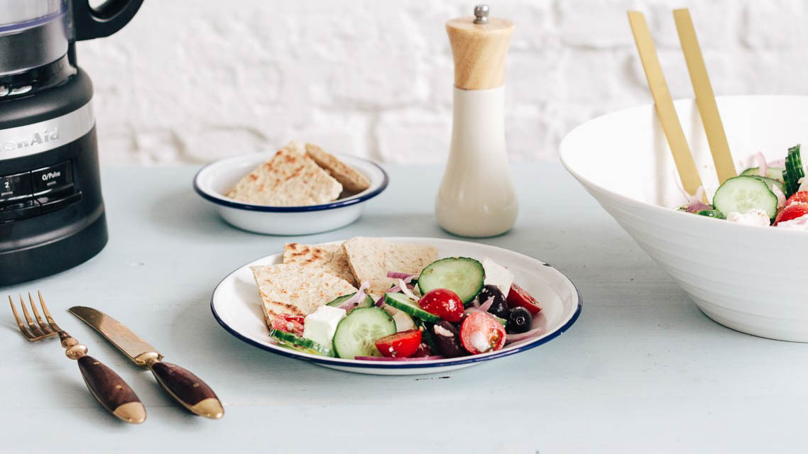 Salte oliven, søde cherrytomater, sprødt rødløg og en syrlig citronvinaigrette – denne farverige, solbeskinnede fetasalat emmer af græsk gavmildhed. Biks det sammen på få minutter, og servér det med sprødt brød.